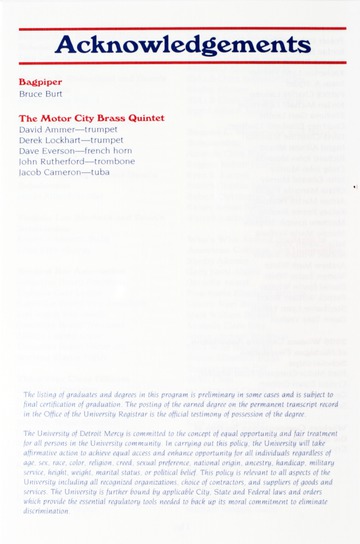 A commencement exercise begins with a procession of the students, faculty, and administrators in academic regalia. The procession is most often led by the macebearer carrying the mace which symbolizes the authority granted by the Board of Trustees to the President of the University. A Grand Marshal (usually a professor) who presides over the ceremony follows the macebearer.Please contact the library reference desk at edesk@udmercy.edu  or 313-993-1071 for assistance with this collection.