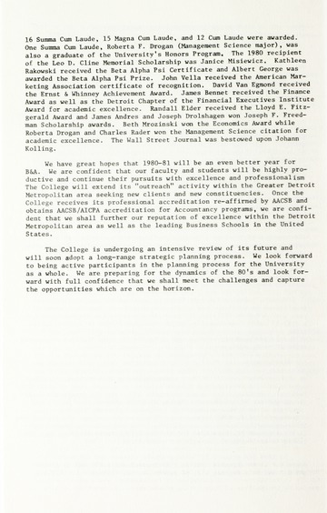 The second of the UDM Convocations is he Honors Convocation. Annually, the University of Detroit Mercy (previously University of Detroit and Mercy College of Detroit) recognizes those students who have achieved scholastic and service honors, special awards, and scholarships. Booklets are printed lising students named to the National Honor Societies, such as Alpha Psi Omega, and Kappa Gamma Pi.