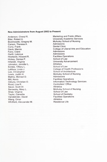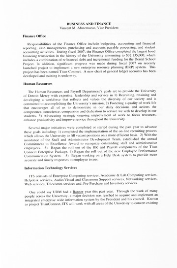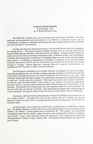 The University of Detroit Mercy has primarily held two types of convocations. The first is the annual convocation called by the president of the university. The purpose of the convocations is for the President to provide a "state of the university" speech and the Provost/Vice President for Academic Affairs to provide a "state of academic affairs" overview. Over the years, convocations have also provided an opportunity to introduce new faculty, staff, and/or administrators and to honor those individuals who have retired from the university during the previous academic year. For many years, a booklet was distributed in which the Deans of the colleges/schools and the Deans of the academic support units provided annual reports on their respective unit’s successes and challenges. As time went on annual reports from major administrative offices, such as student life and admissions and enrollment management were added to the booklet.