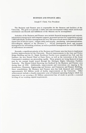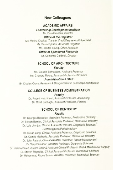 When viewed collectively, the booklets provide an ongoing history of the university. The annual reports have covered curricular changes, individual recognitions such as awards and grants received, new resources being provided to the university community, and community outreach efforts. In addition, changes in leadership, whether at the presidential or dean level, growth in specific programs as the faculty numbers increased, and the retirement or death of long serving members of the university are noted.
