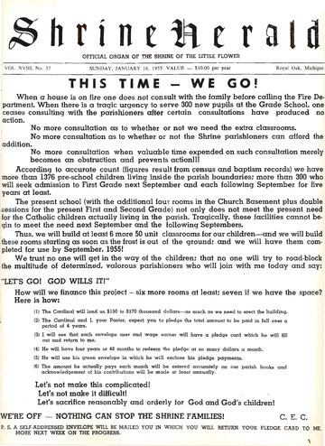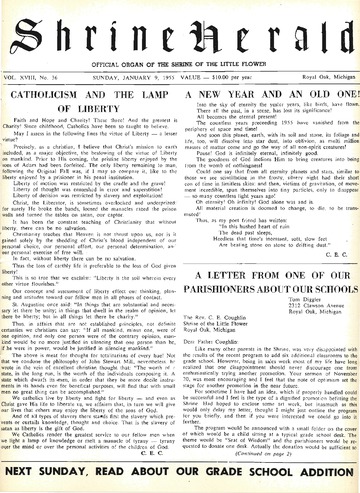 The Shrine Herald is the weekly parish newsletter for the National Shrine of the Little Flower. It began publication in November, 1935, and continues today. The newsletter reports activities within the parish, including the many parish organizations. It reports births, baptisms, marriages and deaths in the parish, information about upcoming events and services, and it serves to post events within the Archdiocese of Detroit. Links to PDFs of all available issues of the Herald appear below.