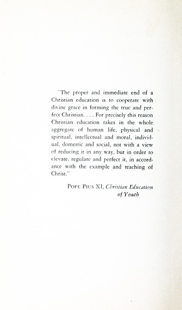 The proper and immediate end of a Christian education is to cooperate with divine grace in forming the true and perfect Christian….For precisely this reason Christian education takes in the whole aggregate of human life, physical and spiritual, intellectual and moral, individual, domestic and social, not with a view of reducing it in any way, but in order to elevate, regulate and perfect it, in accordance with the example and teaching of Christ.