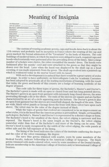 In addition to the student graduation information, the commencement booklets provide a history of the individuals who served as presidents of the university, deans of the respective colleges/schools, grand marshals, honorary degree recipients, and speakers at the graduation ceremonies. With the title of degrees granted in each booklet, it is also possible to determine when specific degrees programs were added or discontinued within the university.