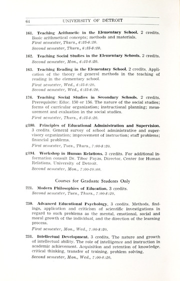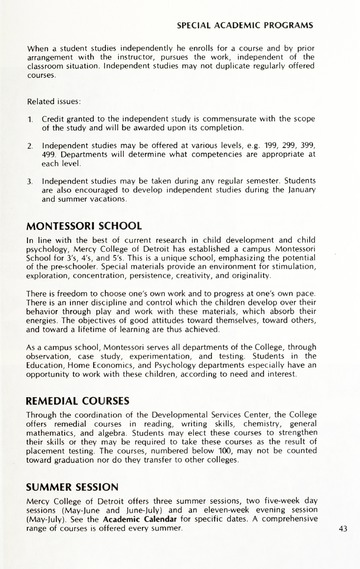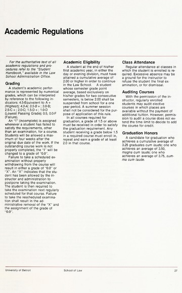 The historical Undergraduate and Graduate Catalogs contain information about academic programs, course descriptions and student services offered by University of Detroit Mercy or the previous institutions known as Mercy College of Detroit and University of Detroit. The catalogs also contain general University and specific academic policies and degree requirements for the academic year that the catalog was published. In some cases the catalogs spanned more than one academic year. The catalogs are the primary source of academic information and are intended to complement other university information including specific materials supplied by schools, colleges, departments, and programs.
