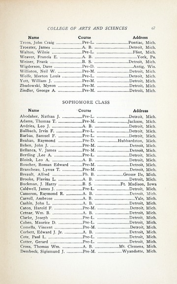 A listing of all degrees conferred, year received, school, and if person was deceased by Detroit College was included in the bulletins from 1883 to 1915.