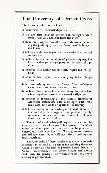 The first Mercy College, conducted by the Religious Sisters of Mercy, Province of Detroit, Catalogue was published in 1942. The foreword to the first and subsequent catalogues includes a quote from Pope Pius XI, Christian Education of Youth (Divini illius magistri encyclical).