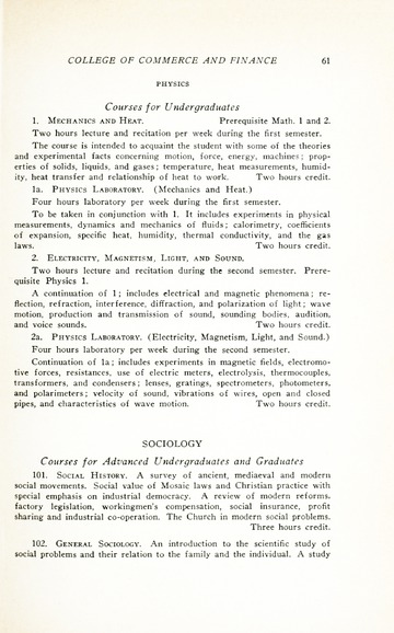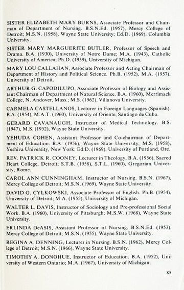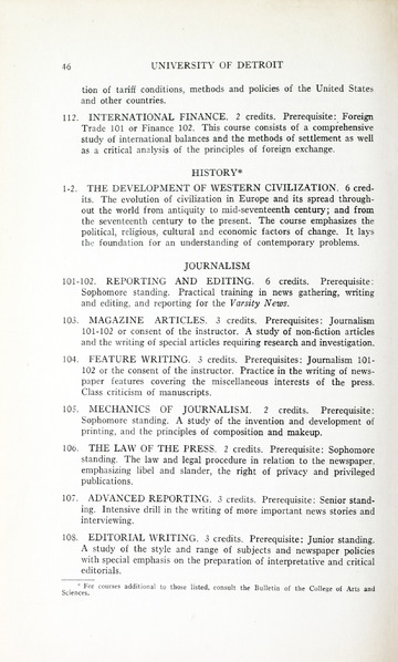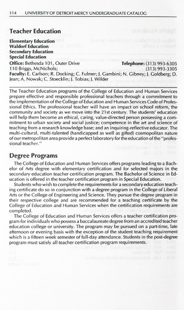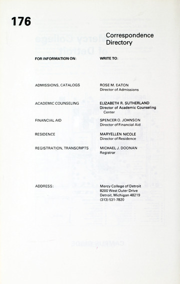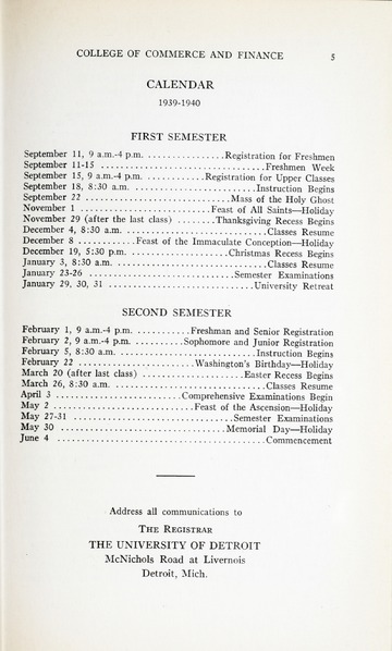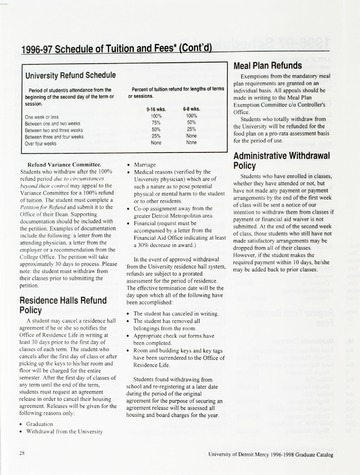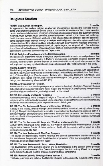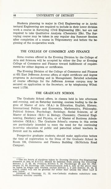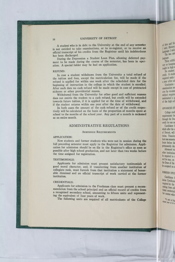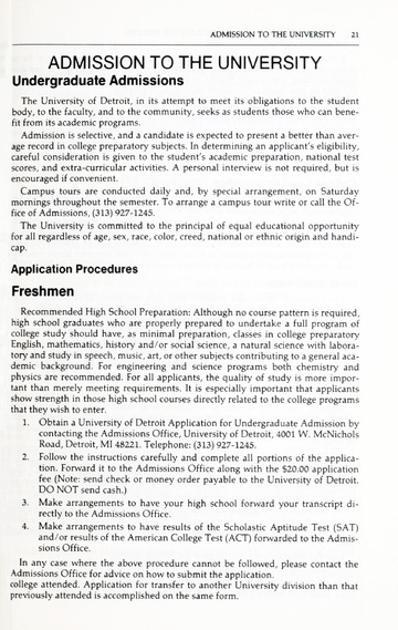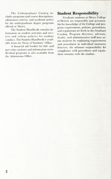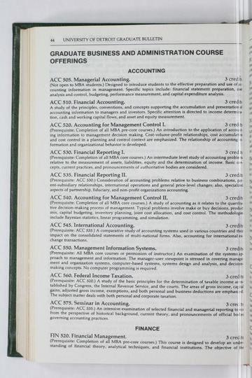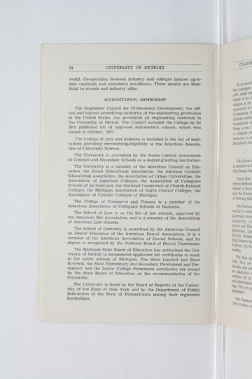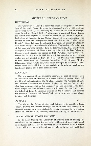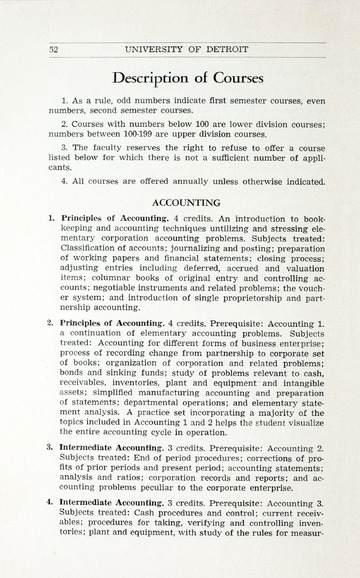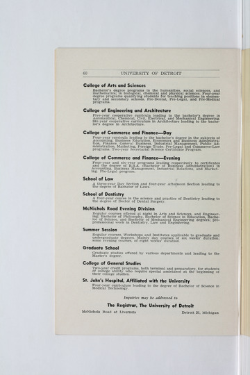 The historical Undergraduate and Graduate Catalogs contain information about academic programs, course descriptions and student services offered by University of Detroit Mercy or the previous institutions known as Mercy College of Detroit and University of Detroit. The catalogs also contain general University and specific academic policies and degree requirements for the academic year that the catalog was published. In some cases the catalogs spanned more than one academic year. The catalogs are the primary source of academic information and are intended to complement other university information including specific materials supplied by schools, colleges, departments, and programs.