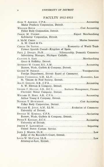 The first University Bulletin from Detroit College was published in 1877. Between 1877 and 1932 the bulletins included much more information than is found in recent catalogs. Beyond the description of the academic departments, and individual courses, the earlier publications included the University Calendar, faculty members, board of trustee members, scholarships awarded, honors lists, names of all class members and officers, and student organizations with officers. Detroit College bulletins from 1883 to 1915 listed all degrees conferred, years received and school. A notation was made for those alumni who were deceased.