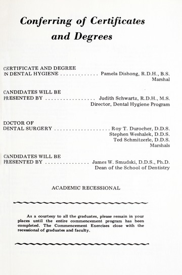 In addition to the student graduation information, the commencement booklets provide a history of the individuals who served as presidents of the university, deans of the respective colleges/schools, grand marshals, honorary degree recipients, and speakers at the graduation ceremonies. With the title of degrees granted in each booklet, it is also possible to determine when specific degrees programs were added or discontinued within the university.