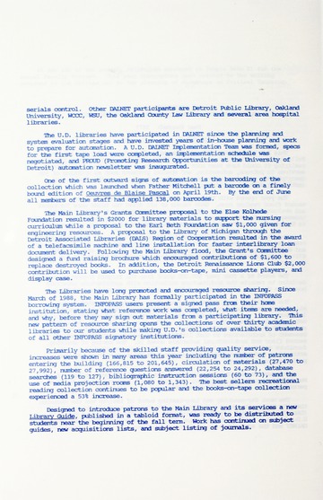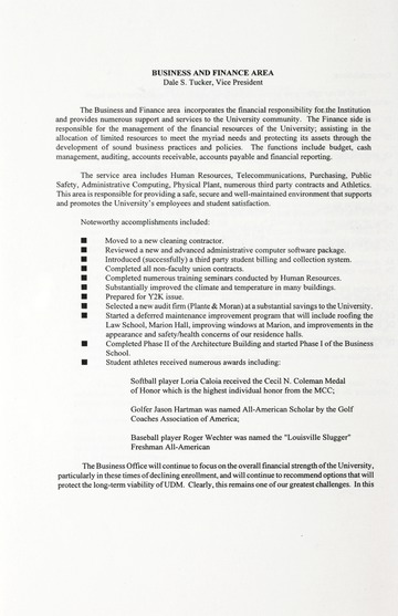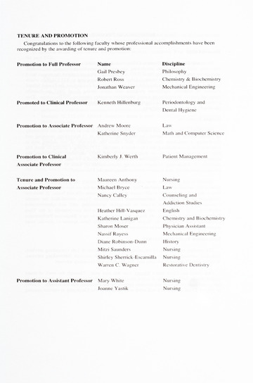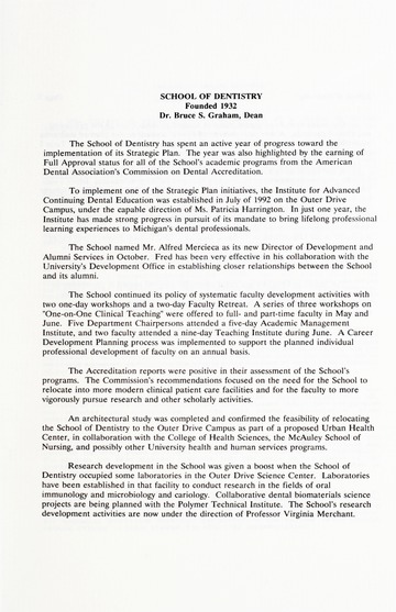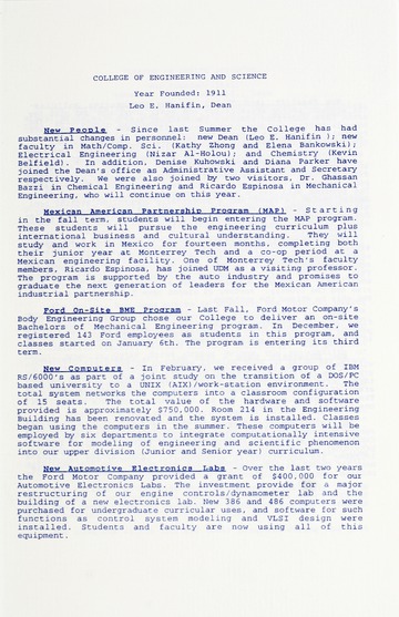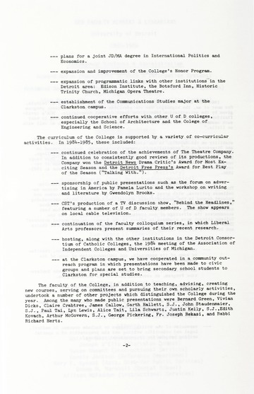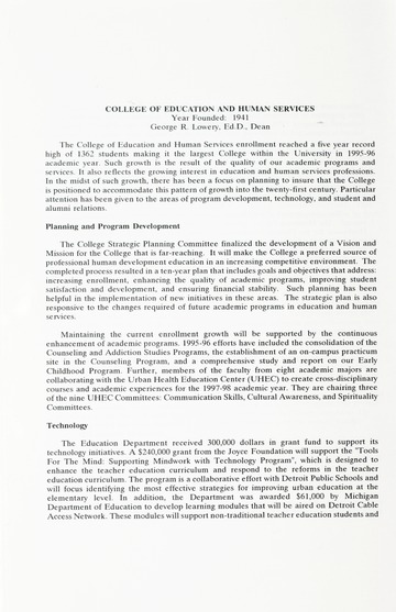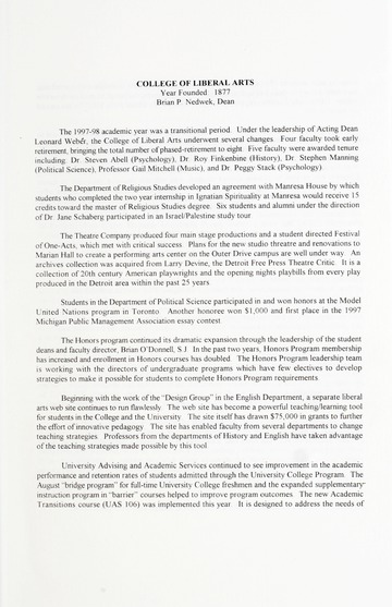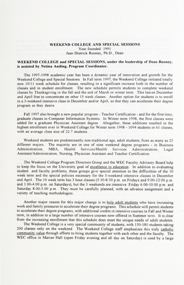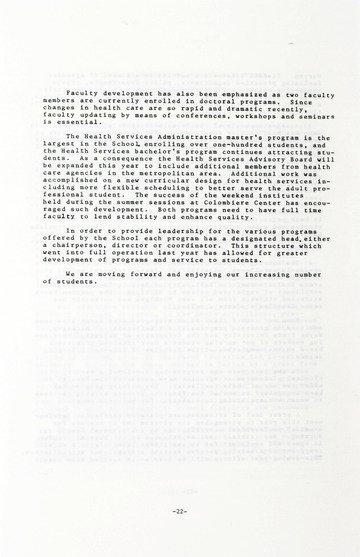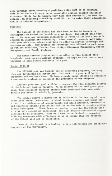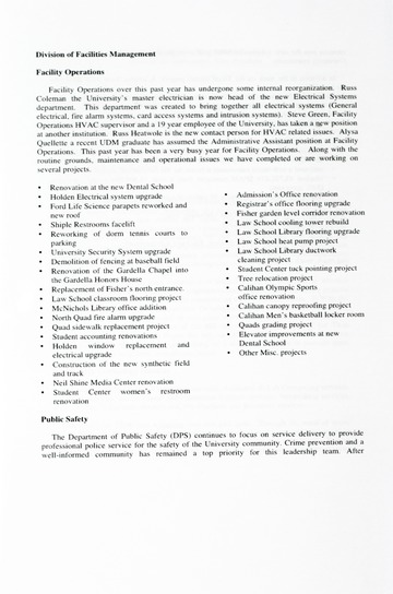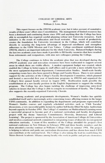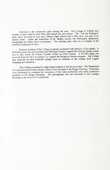 When viewed collectively, the booklets provide an ongoing history of the university. The annual reports have covered curricular changes, individual recognitions such as awards and grants received, new resources being provided to the university community, and community outreach efforts. In addition, changes in leadership, whether at the presidential or dean level, growth in specific programs as the faculty numbers increased, and the retirement or death of long serving members of the university are noted.