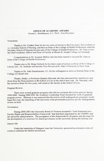 The University of Detroit Mercy has primarily held two types of convocations. The first is the annual convocation called by the president of the university. The purpose of the convocations is for the President to provide a "state of the university" speech and the Provost/Vice President for Academic Affairs to provide a "state of academic affairs" overview. Over the years, convocations have also provided an opportunity to introduce new faculty, staff, and/or administrators and to honor those individuals who have retired from the university during the previous academic year. For many years, a booklet was distributed in which the Deans of the colleges/schools and the Deans of the academic support units provided annual reports on their respective unit’s successes and challenges. As time went on annual reports from major administrative offices, such as student life and admissions and enrollment management were added to the booklet.