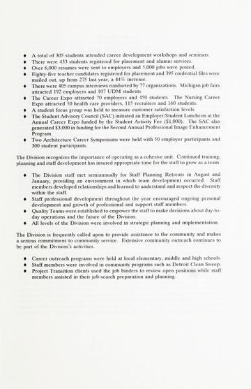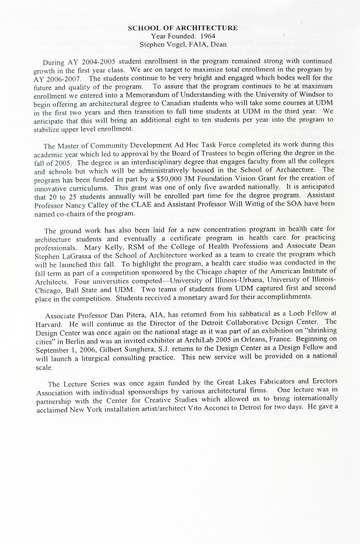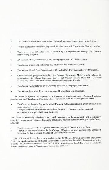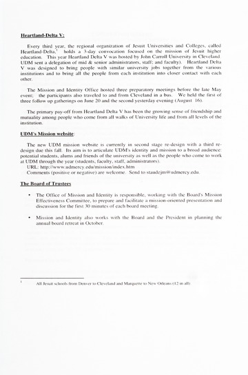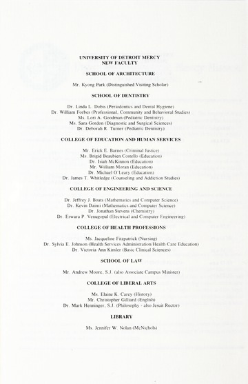 The University of Detroit Mercy has primarily held two types of convocations. The first is the annual convocation called by the president of the university. The purpose of the convocations is for the President to provide a "state of the university" speech and the Provost/Vice President for Academic Affairs to provide a "state of academic affairs" overview. Over the years, convocations have also provided an opportunity to introduce new faculty, staff, and/or administrators and to honor those individuals who have retired from the university during the previous academic year. For many years, a booklet was distributed in which the Deans of the colleges/schools and the Deans of the academic support units provided annual reports on their respective unit’s successes and challenges. As time went on annual reports from major administrative offices, such as student life and admissions and enrollment management were added to the booklet.