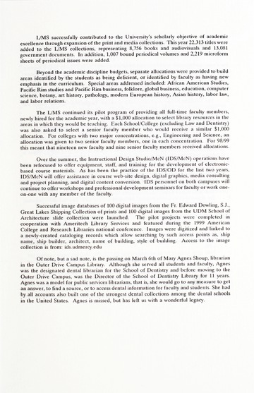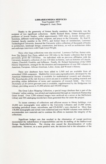 When viewed collectively, the booklets provide an ongoing history of the university. The annual reports have covered curricular changes, individual recognitions such as awards and grants received, new resources being provided to the university community, and community outreach efforts. In addition, changes in leadership, whether at the presidential or dean level, growth in specific programs as the faculty numbers increased, and the retirement or death of long serving members of the university are noted.
